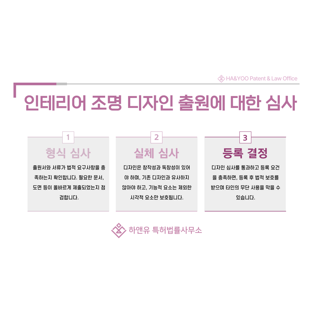 기능적 성능이나 조도, 전기회로 구조는 특허의 영역이지만, 조명의 형태, 무늬, 색채, 빛의 배열과 같은 시각적 요소는 디자인권으로 보호됩니다.