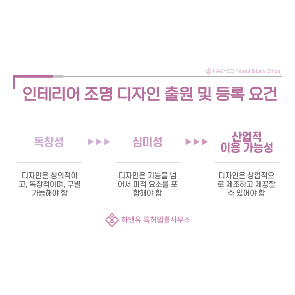따라서 조명 디자인은 형태와 빛의 조합을 통해 고유의 미적 완성도를 보여야 등록 요건을 충족할 수 있습니다.