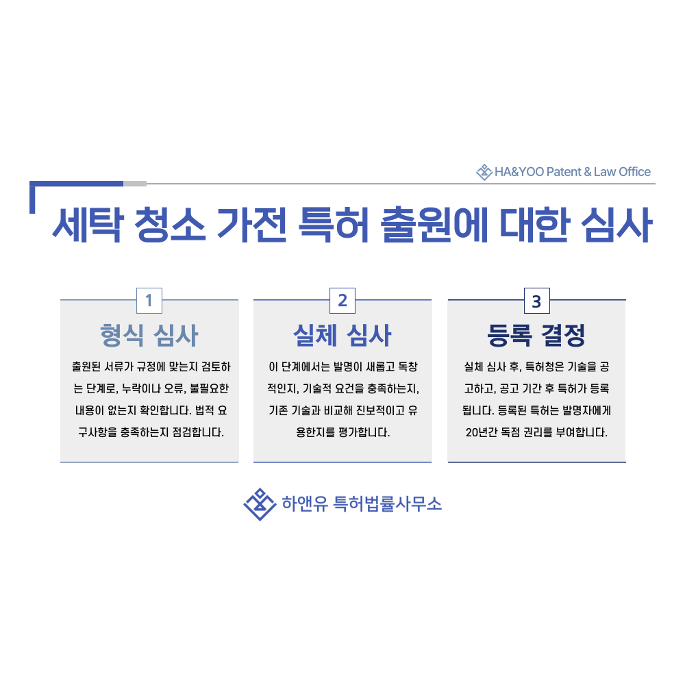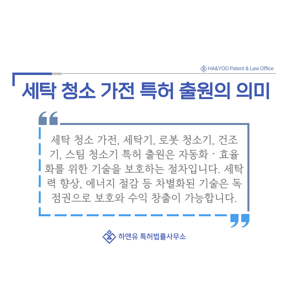 따라서 세탁·청소 가전 기술의 특허 출원은 기술적 신뢰와 법적 안정성을 동시에 확보하는 필수 절차입니다.