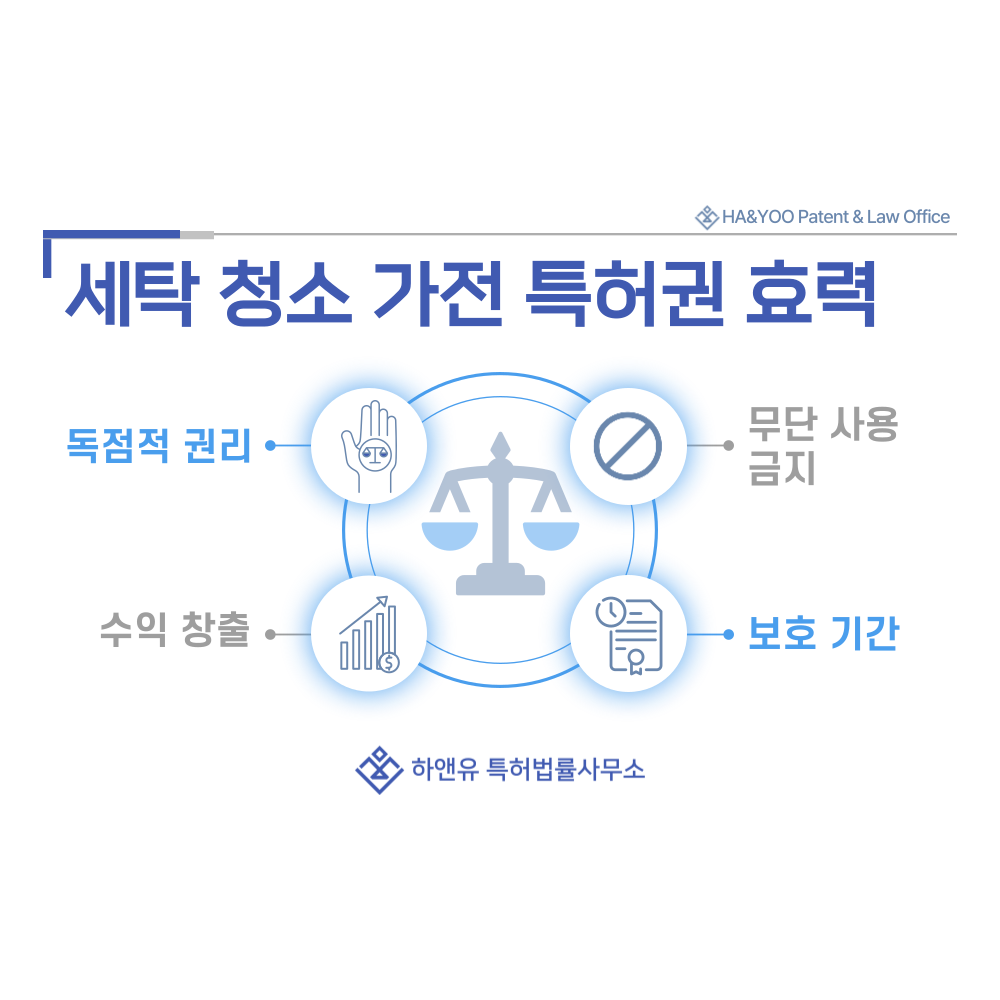 세탁 청소 가전의 특허가 등록되면 발명자는 해당 기술을 독점적으로 사용할 수 있는 권리를 가지게 됩니다.