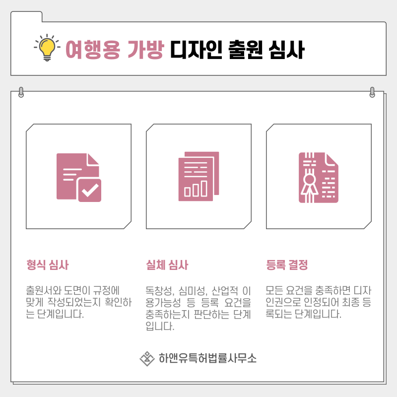수납용 가방, 트래블 기어, 백팩, 캐리어 디자인이 출원되면 먼저 형식적인 요건을 확인하는 형식심사가 진행됩니다.