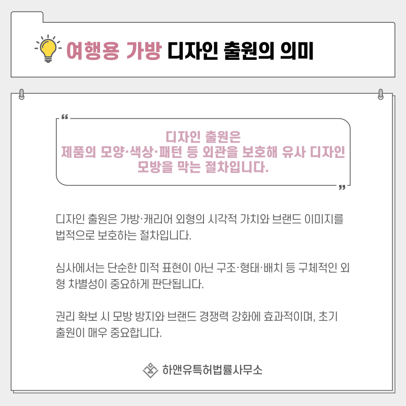특히 가방·캐리어와 같이 모방이 쉬운 제품군에서는 사전 권리 확보가 매우 효과적인 방어 수단이 됩니다.