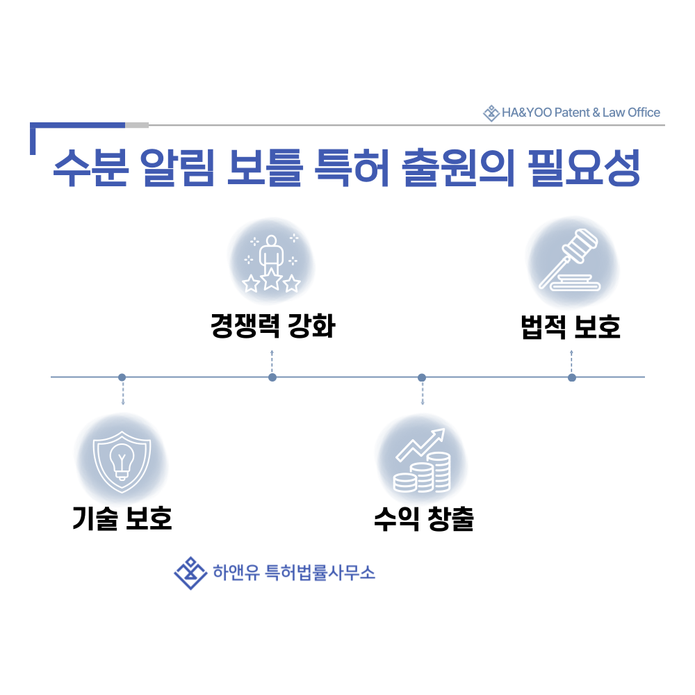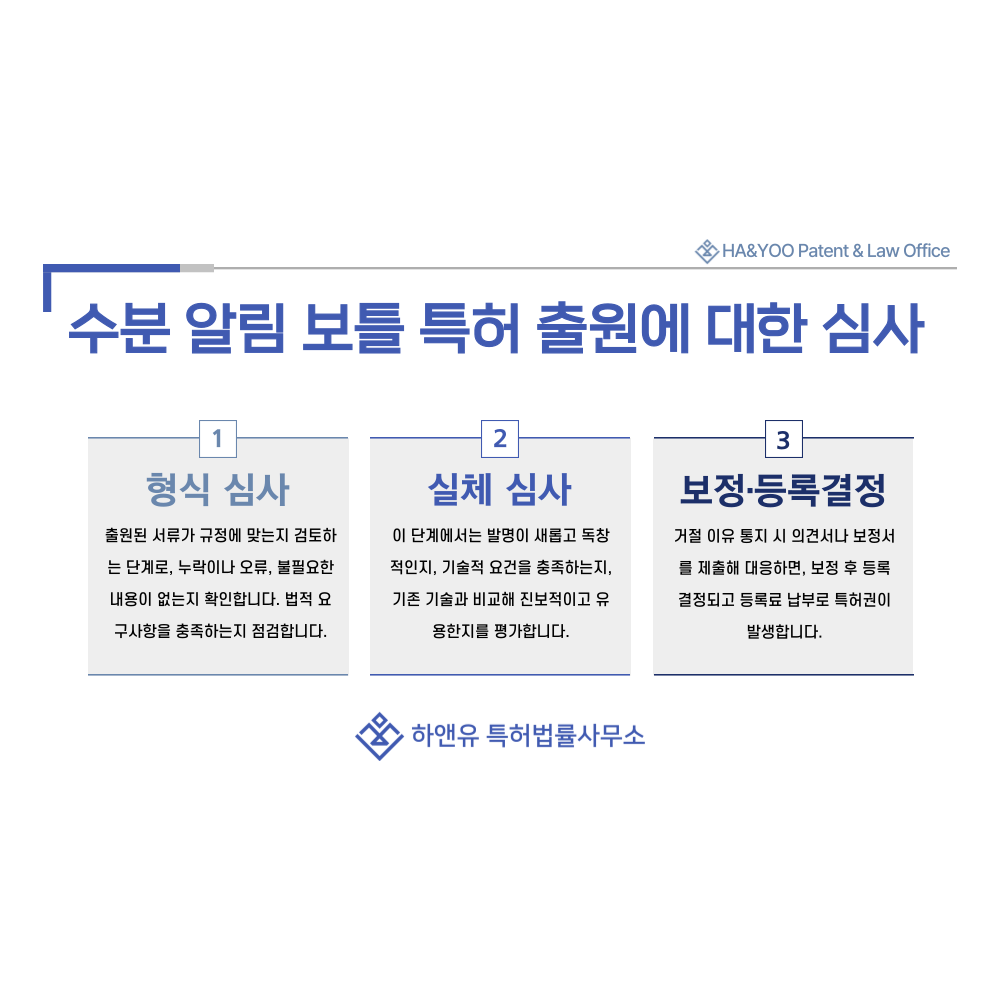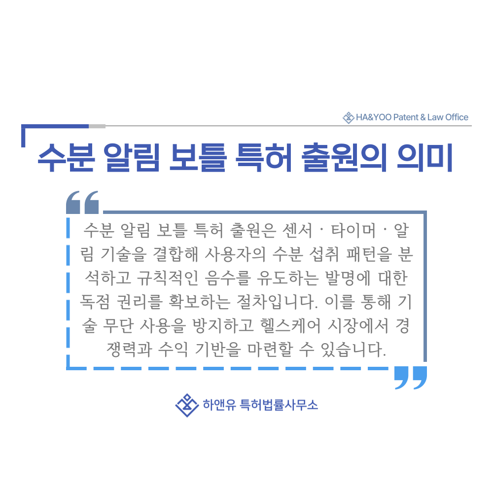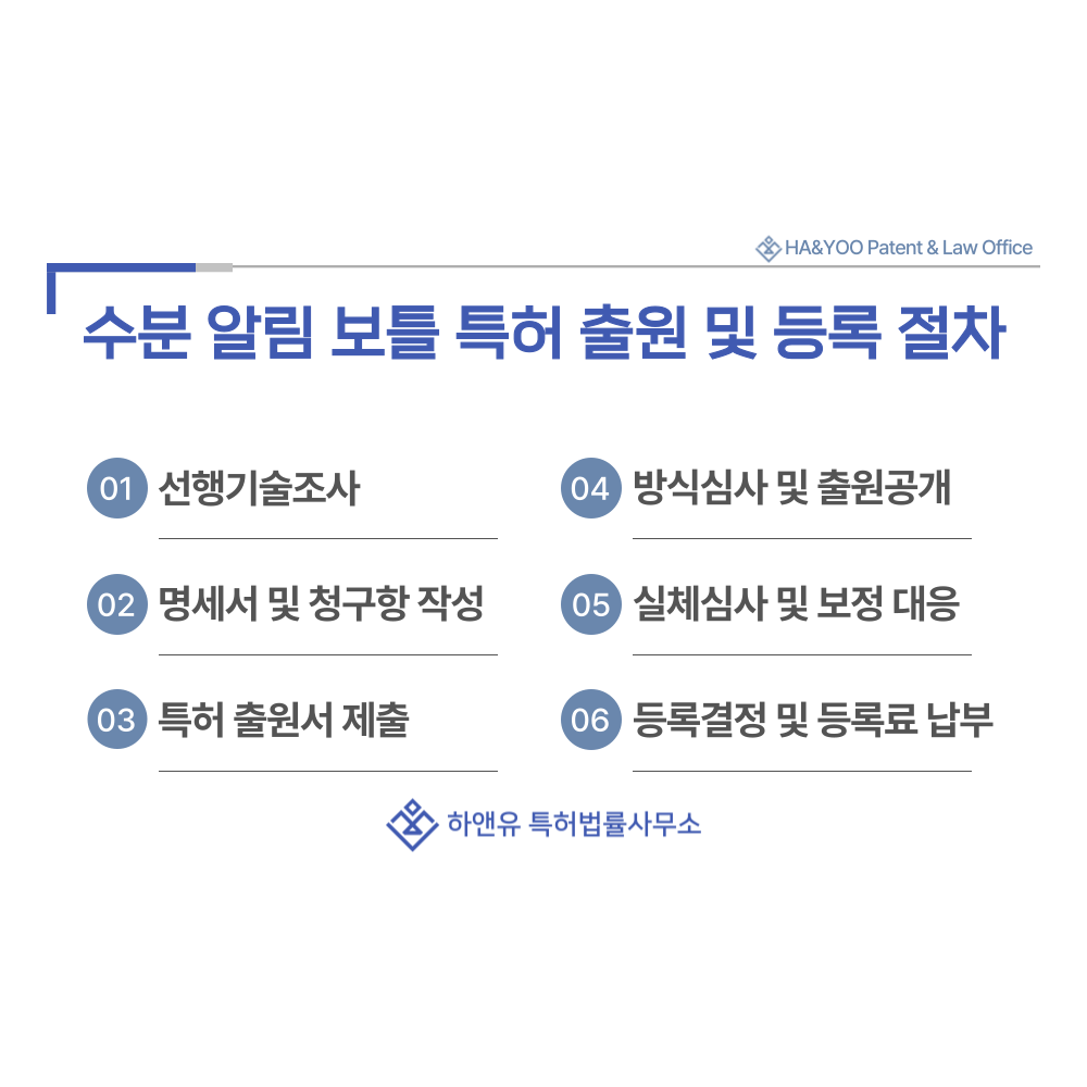 수분 알림 보틀·수분 섭취 알림 병의 특허 출원 절차와 등록 요건, 심사 과정, 권리 효력까지 전문적으로 안내합니다.