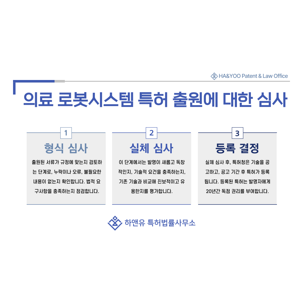 수술현미경, 복강경, 관절경, 수술로봇 장치와 같은 의료기기 기술을 출원하면 가장 먼저 형식심사가 진행됩니다.
