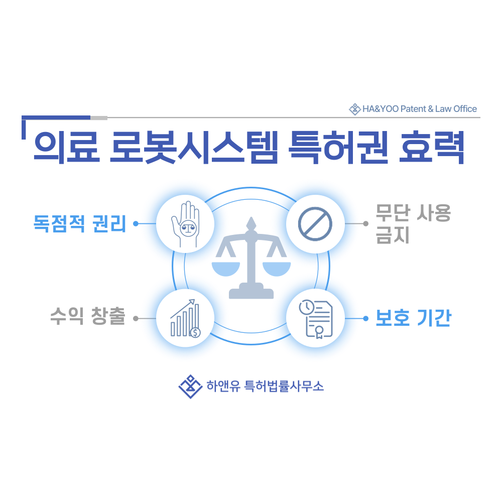 경쟁사가 특허받은 수술로봇의 제어 알고리즘이나 복강경의 영상 시스템을 모방할 경우, 침해금지청구나 손해배상을 청구할 수 있습니다.