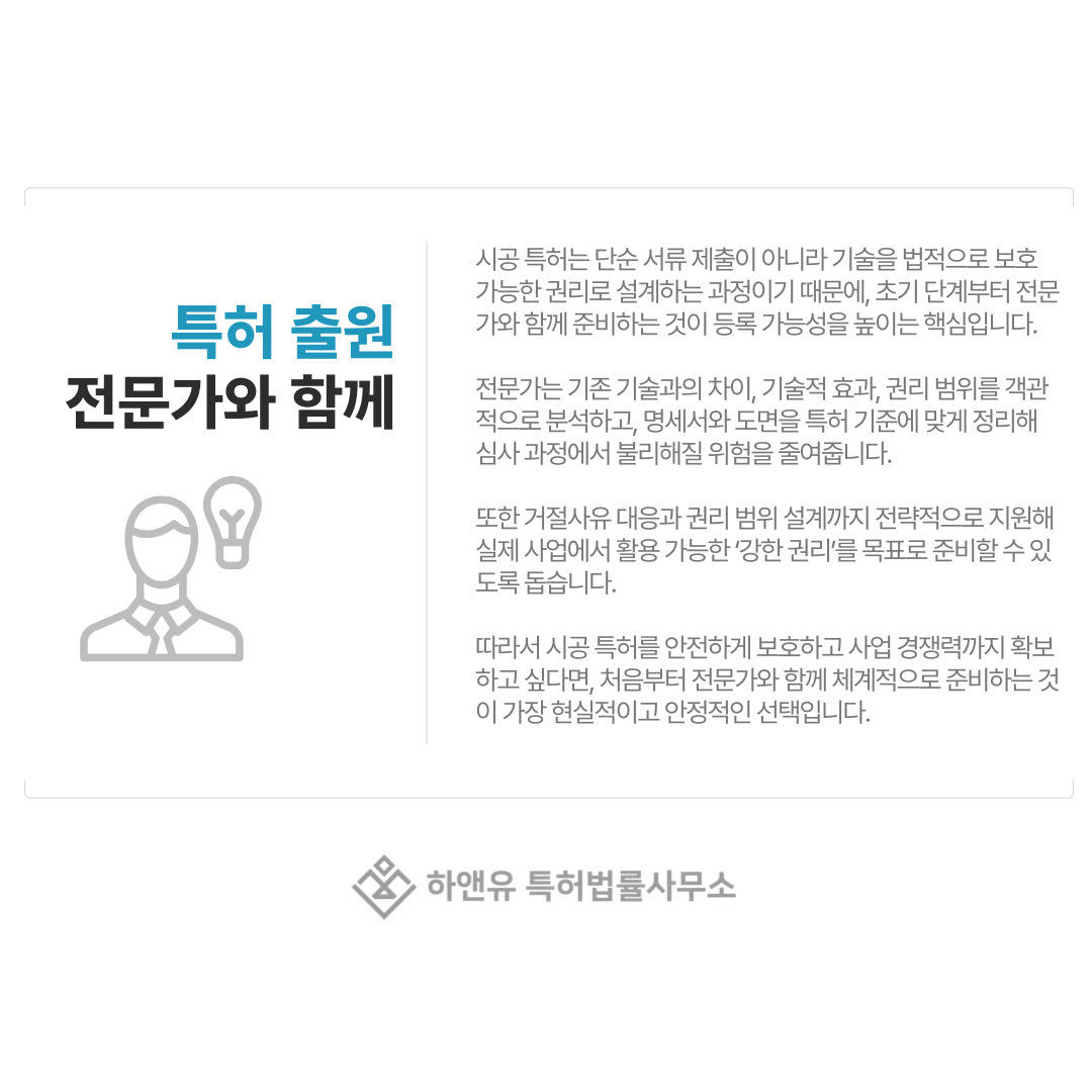 이 과정이 제대로 이루어져야 시공 특허가 진짜 ‘가치 있는 자산’으로 활용될 수 있습니다.
