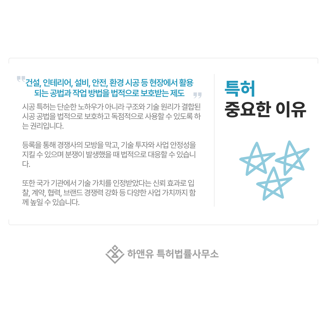 또한 시공 특허에서 가장 중요한 부분은 서류 작성과 기술 구조 정리입니다.
