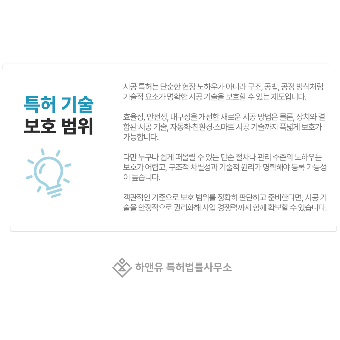 시공 특허로 보호 가능한 기술 범위는 생각보다 훨씬 넓습니다.