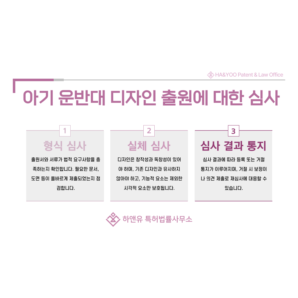 이 과정에서는 아기 운반대 디자인의 신규성, 독창성, 심미성, 산업적 이용 가능성 등을 종합적으로 검토합니다.
