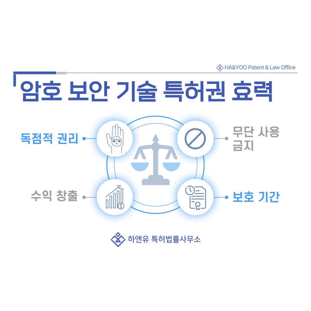 암호, 키관리, 보안, 프라이버시, 인증 기술이 특허로 등록되면 발명자는 해당 기술에 대한 독점적 권리를 가집니다.