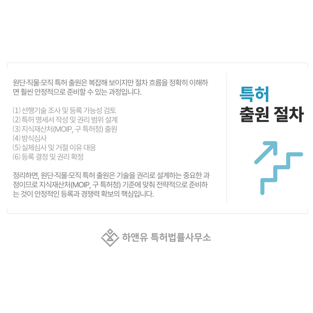원단·직물·모직 특허 출원 절차는 생각보다 복잡해 보이지만, 흐름만 정확히 이해하면 훨씬 쉽게 준비할 수 있습니다.