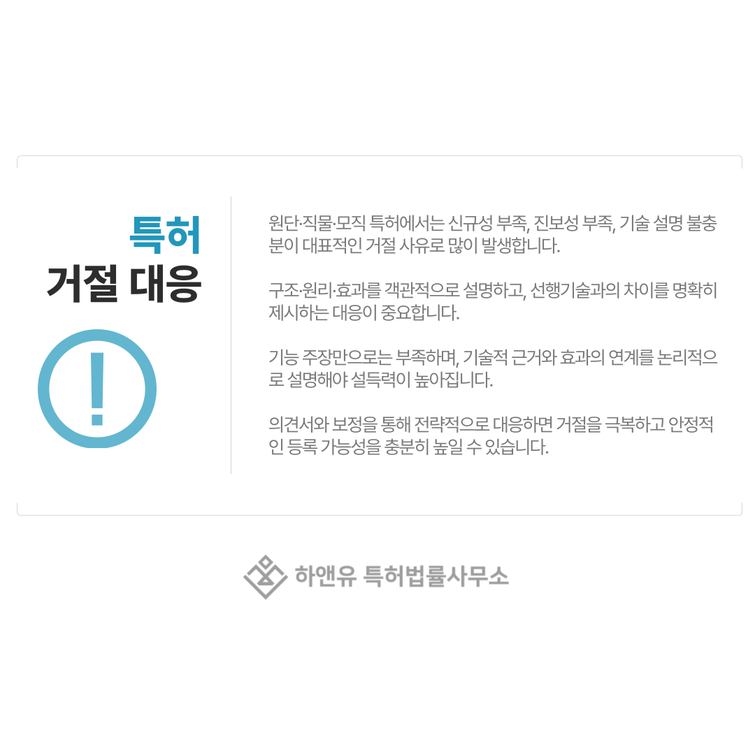 심사 과정에서 발생하는 거절 사유는 단순한 장애물이 아니라, 기술을 특허 기준에 맞게 정리해 나가는 과정이라고 보셔도 좋습니다.