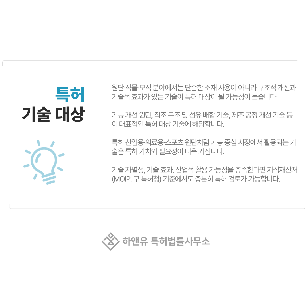 원단·직물·모직 분야에서 어떤 기술이 특허 대상이 될 수 있는지 궁금해하시는 분들이 많습니다.