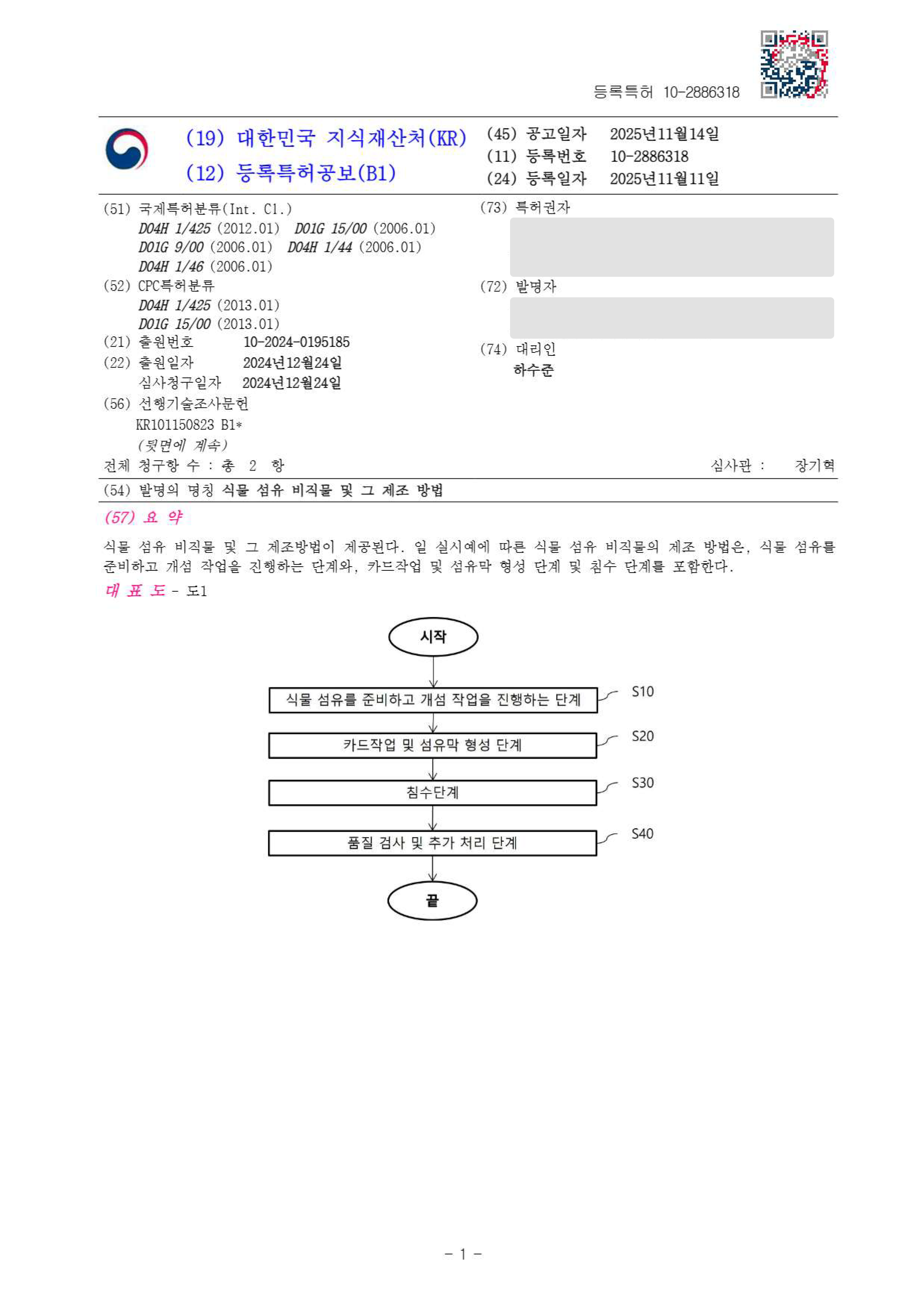 하앤유특허법률사무소를 통해 출원 등록된 원단·직물·모직 특허 등록사례입니다.