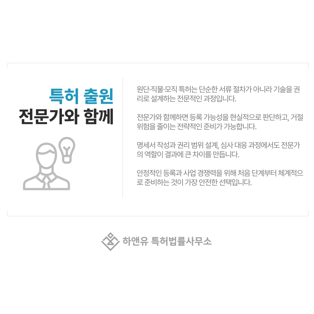 원단 특허, 직물 특허, 모직 특허를 안전하게 보호하고 활용하고자 한다면 처음 단계에서부터 정확한 기준으로 준비하는 것이 가장 중요합니다.