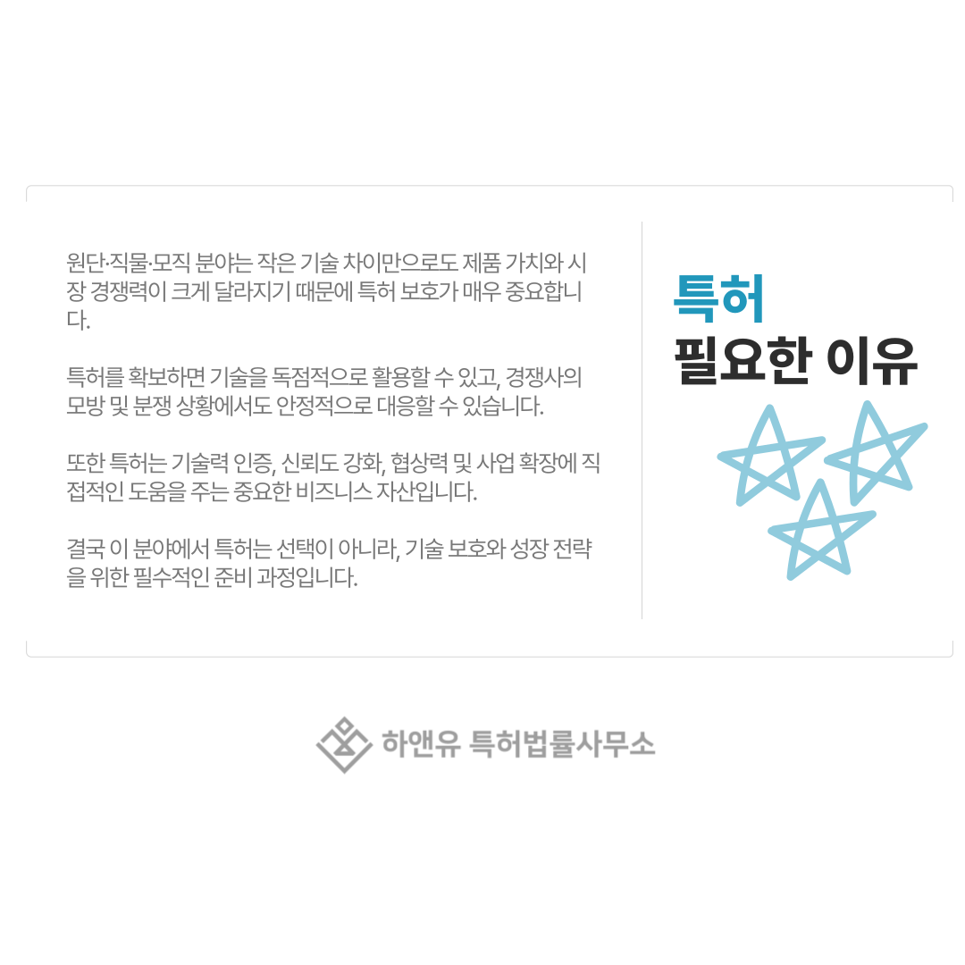그래서 원단·직물·모직 분야에서는 특허를 통해 기술을 법적으로 보호 가능한 권리로 만들어 두는 것이 매우 중요합니다.