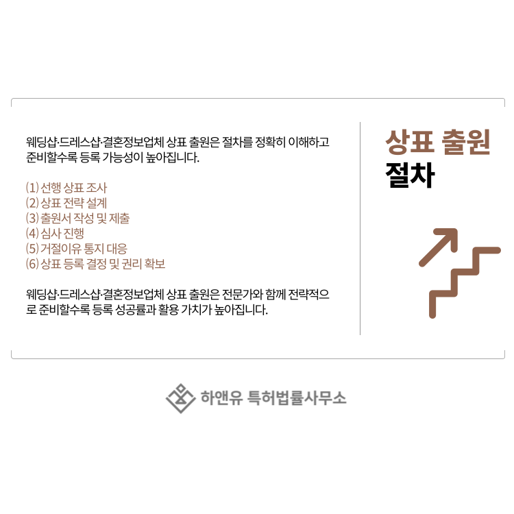 그래서 웨딩샵 상표, 드레스샵 상표, 결혼정보업체 상표는 출원 전부터 전략적으로 준비해야 합니다.