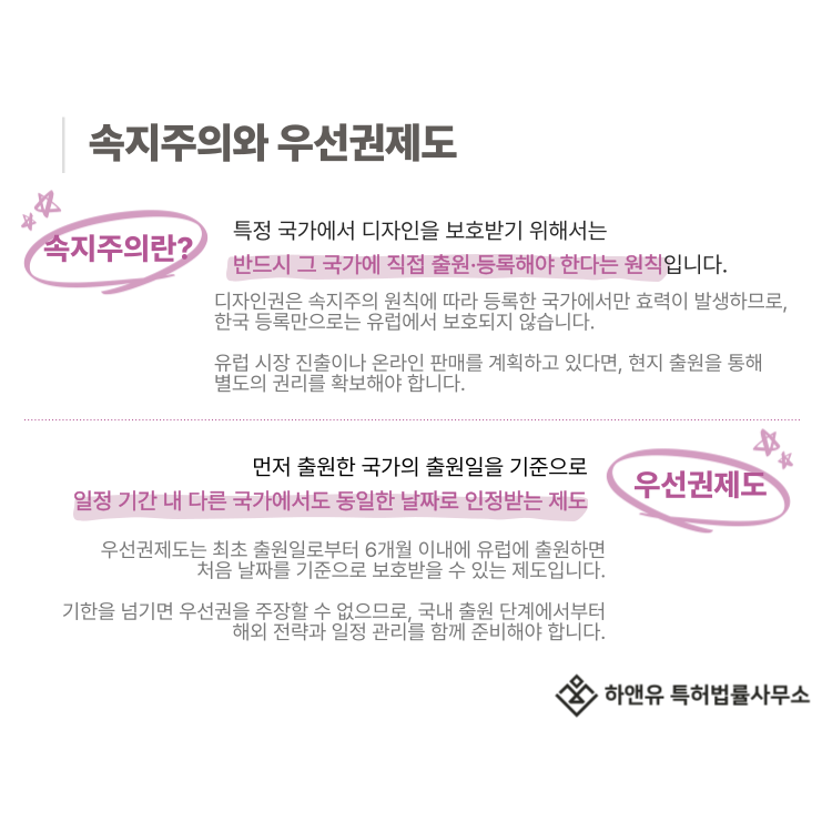 이를 속지주의라고 하며, 한국에서 디자인 등록을 받았더라도 유럽에서는 자동으로 보호되지 않습니다.