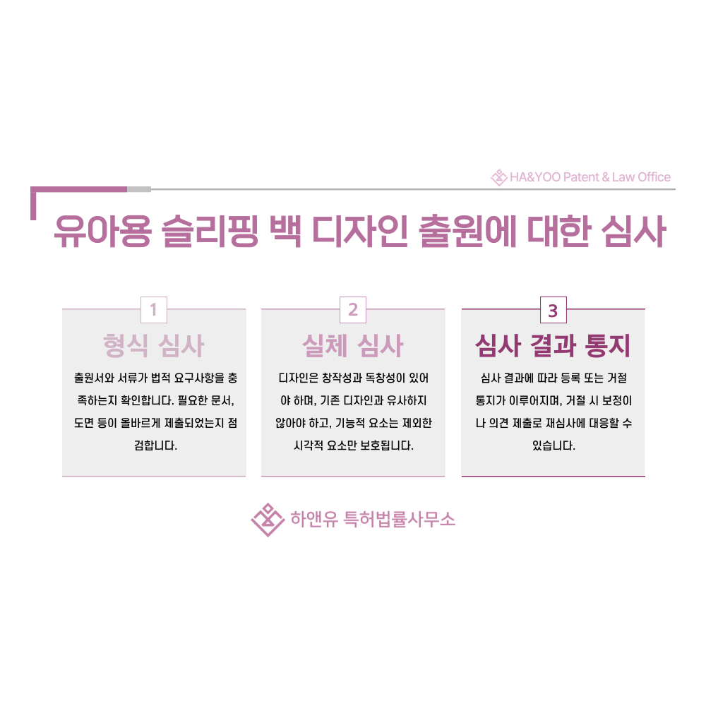 이 과정에서는 유아용 슬리핑 백 디자인의 신규성, 독창성, 심미성, 산업적 이용 가능성 등을 종합적으로 판단합니다.