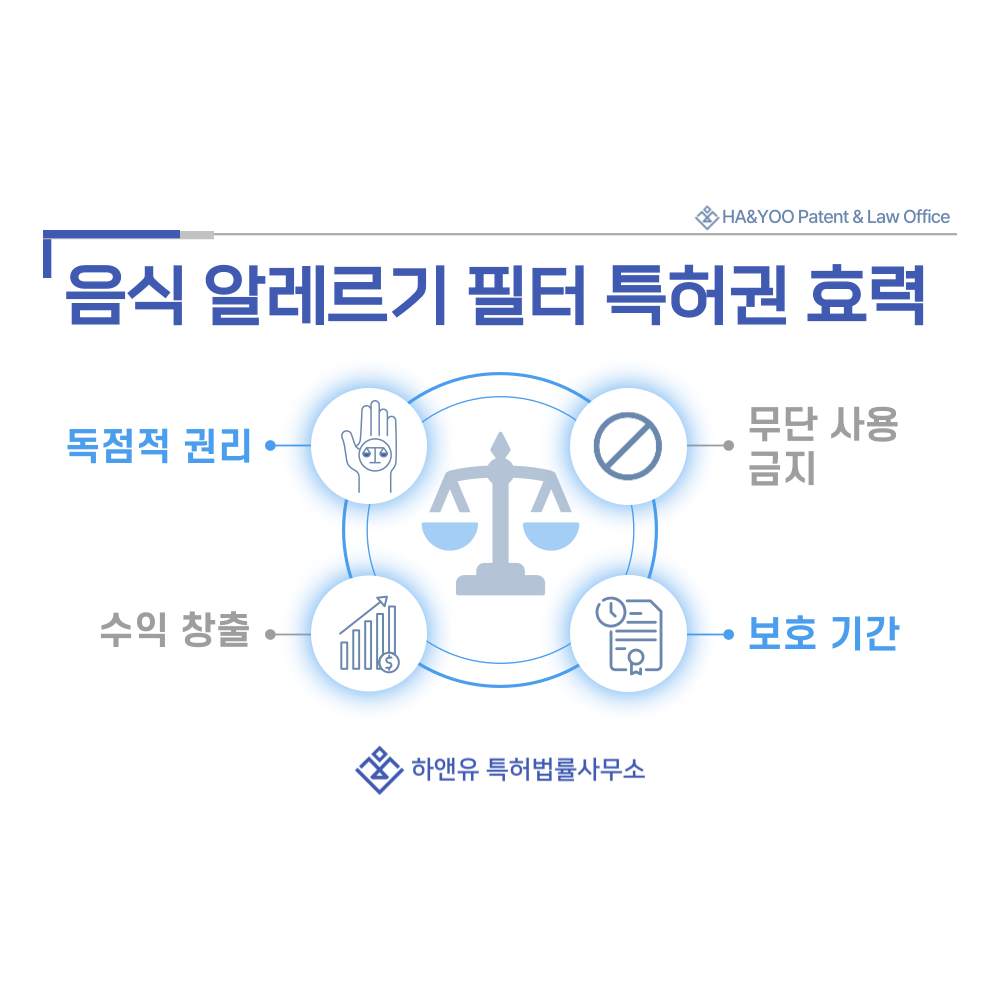 음식 알레르기 감지 필터에 대한 특허권을 취득하면 해당 기술을 독점적으로 실시할 수 있는 권리를 가집니다. 이는 특허권자가 직접 제품을 제조·판매하거나 다른 기업과 협력할 때, 경쟁사가 동일한 기술을 사용하는 것을 막을 수 있음을 의미합니다. 이러한 독점권은 시장 내 기술 우위를 확보하고 장기간 안정적인 사업 기반을 마련하는 데 중요한 역할을 합니다.