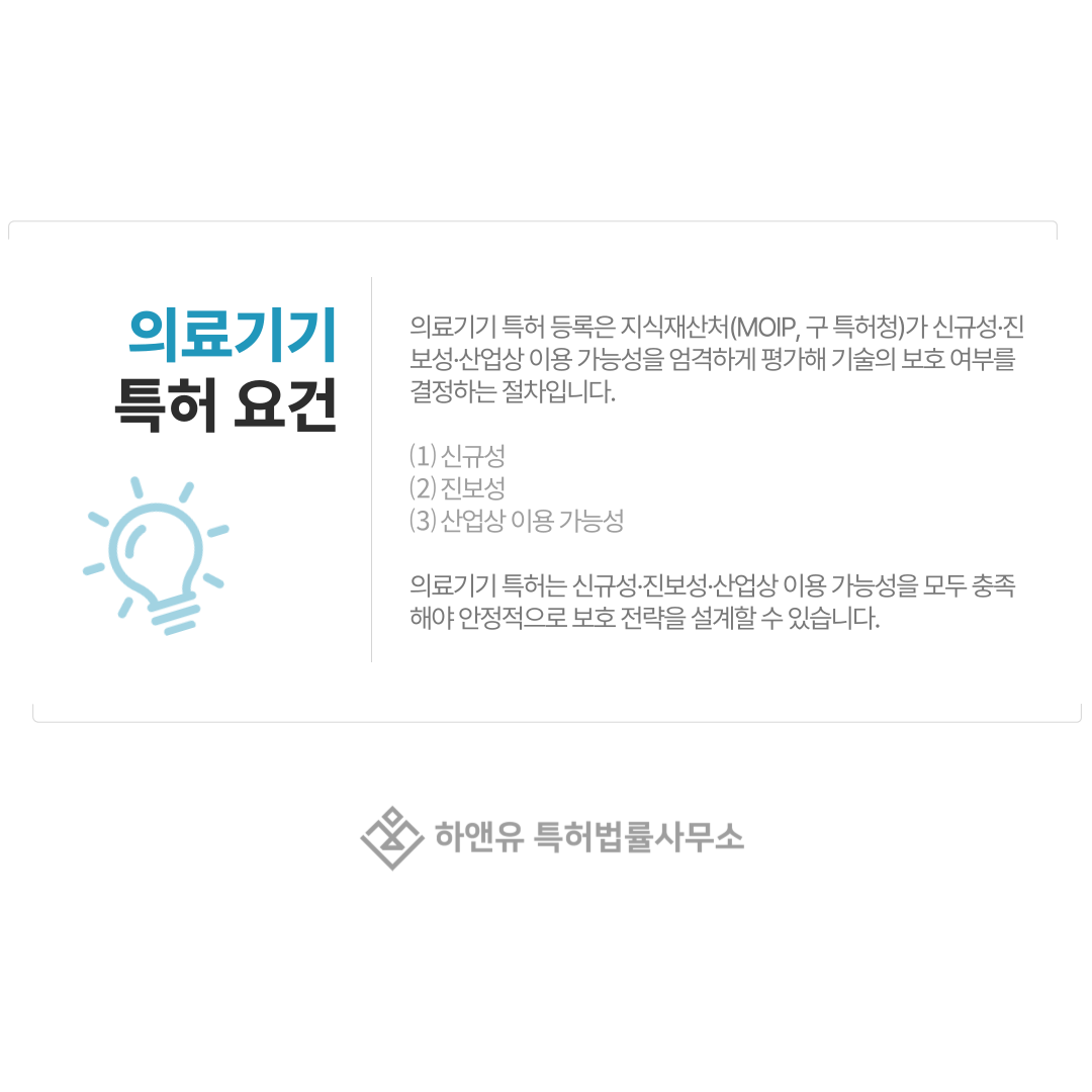 지식재산처(MOIP, 구 특허청)는 의료기기 기술이 특허로 보호받을 수 있는지를 여러 기준으로 엄격하게 판단합니다.