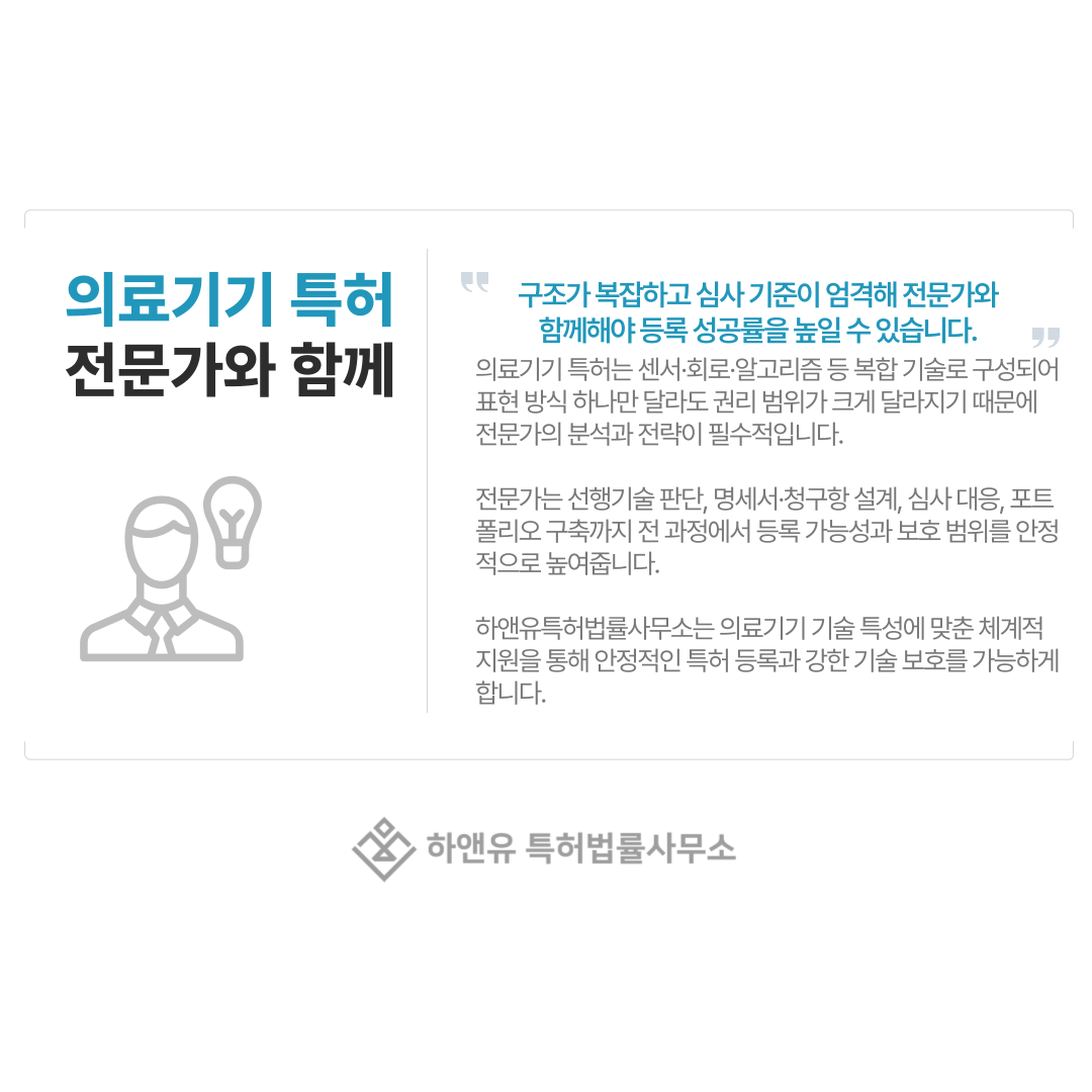 의료기기 특허는 기술적 깊이와 법적 분석이 동시에 요구되는 분야이기 때문에, 전문가와 함께 준비하는 것이 가장 안전하고 효과적인 선택입니다.