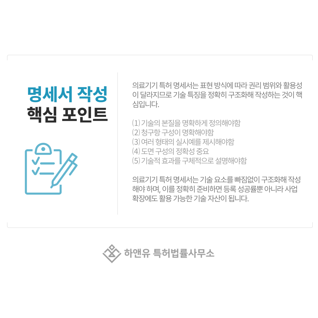 이를 정확하게 준비하면 의료기기 특허의 등록 가능성이 높아질 뿐 아니라, 향후 사업 확장과 기술 협력에서도 강력한 기술 자산으로 활용될 수 있습니다.
