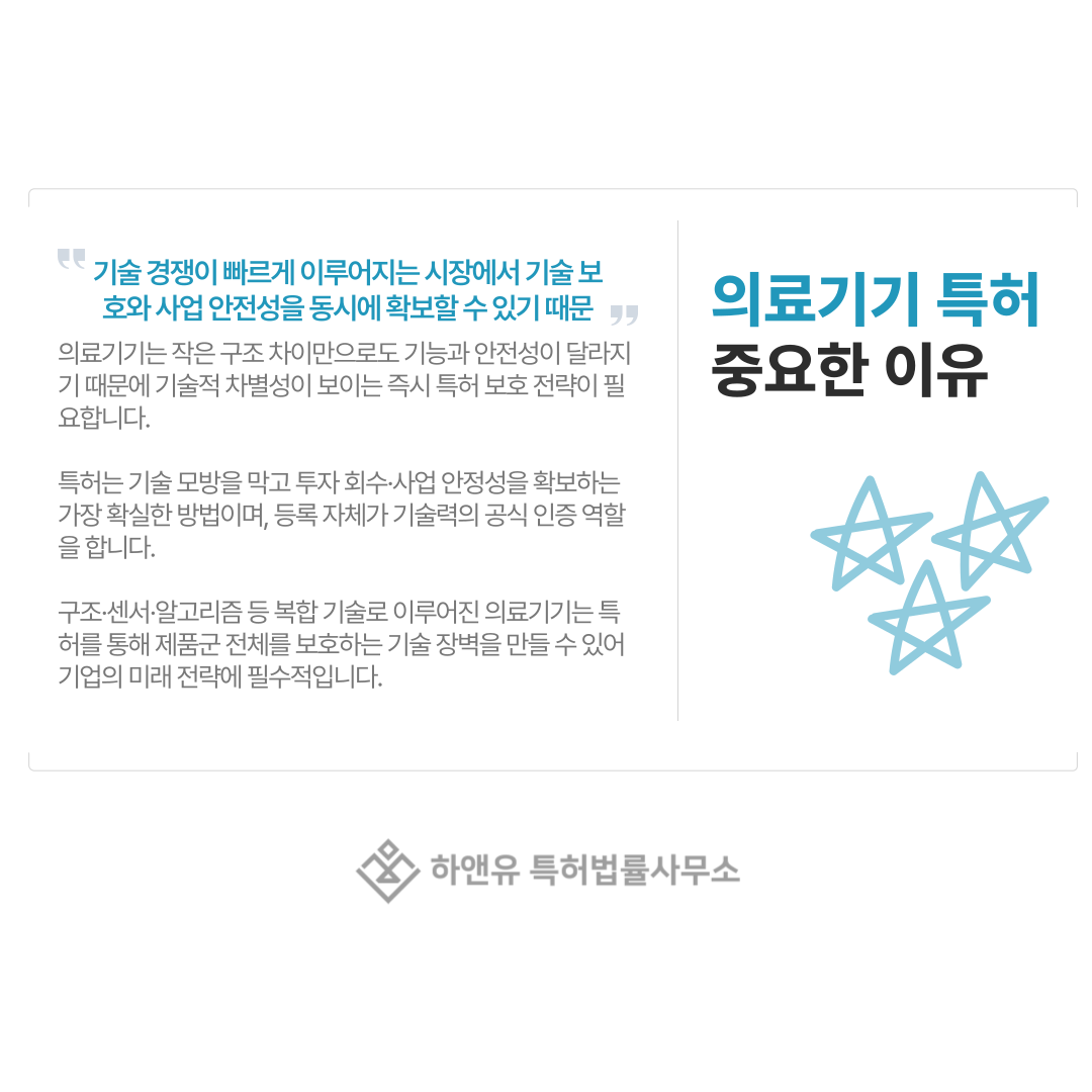 의료기기 시장에서는 ‘특허 기술 보유’가 바로 신뢰도와 직결되기 때문에, 마케팅·홍보·영업 자료에서 특허 보유 사실을 적극적으로 활용할 수 있습니다.