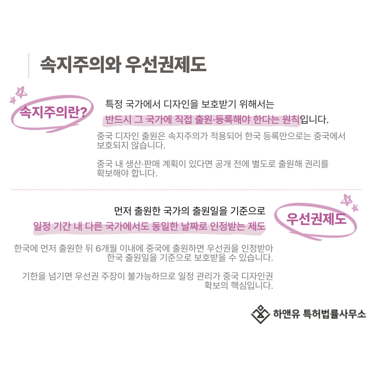 즉, 한국에서 디자인 등록을 받았더라도 중국에서 자동으로 보호되지는 않습니다.