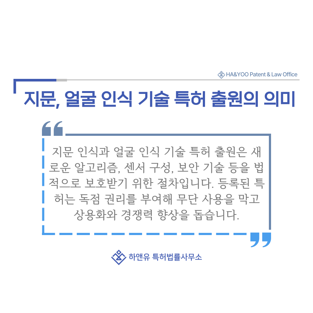 지문 인식과 얼굴 인식 기술에 대한 특허 출원이란, 생체 정보를 이용한 사용자 인증 시스템에서 기존과 다른 새로운 알고리즘, 센서 구성, 데이터 처리 방법, 보안 기술 등이 포함된 경우 이를 법적으로 보호받기 위해 특허청에 등록을 신청하는 절차를 말합니다.