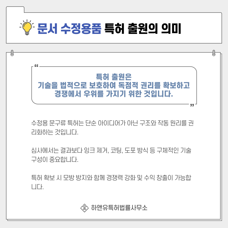 경쟁사가 유사한 수정테이프 구조나 교정액 조성을 사용하는 경우 침해로 판단될 수 있습니다.