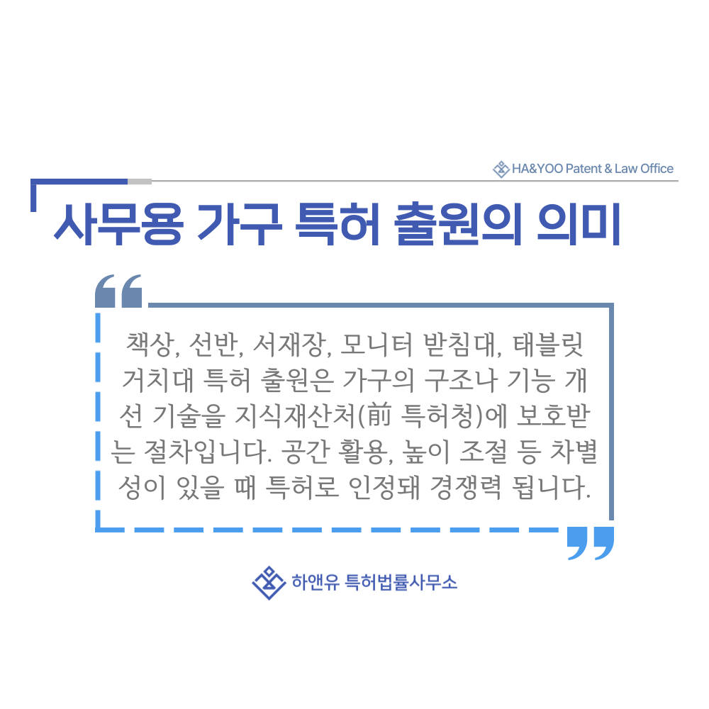 1. 사무용 가구, 책상, 선반, 서재장, 컴퓨터 책상, 모니터 받침대, 태블릿 거치대 특허 출원의 의미