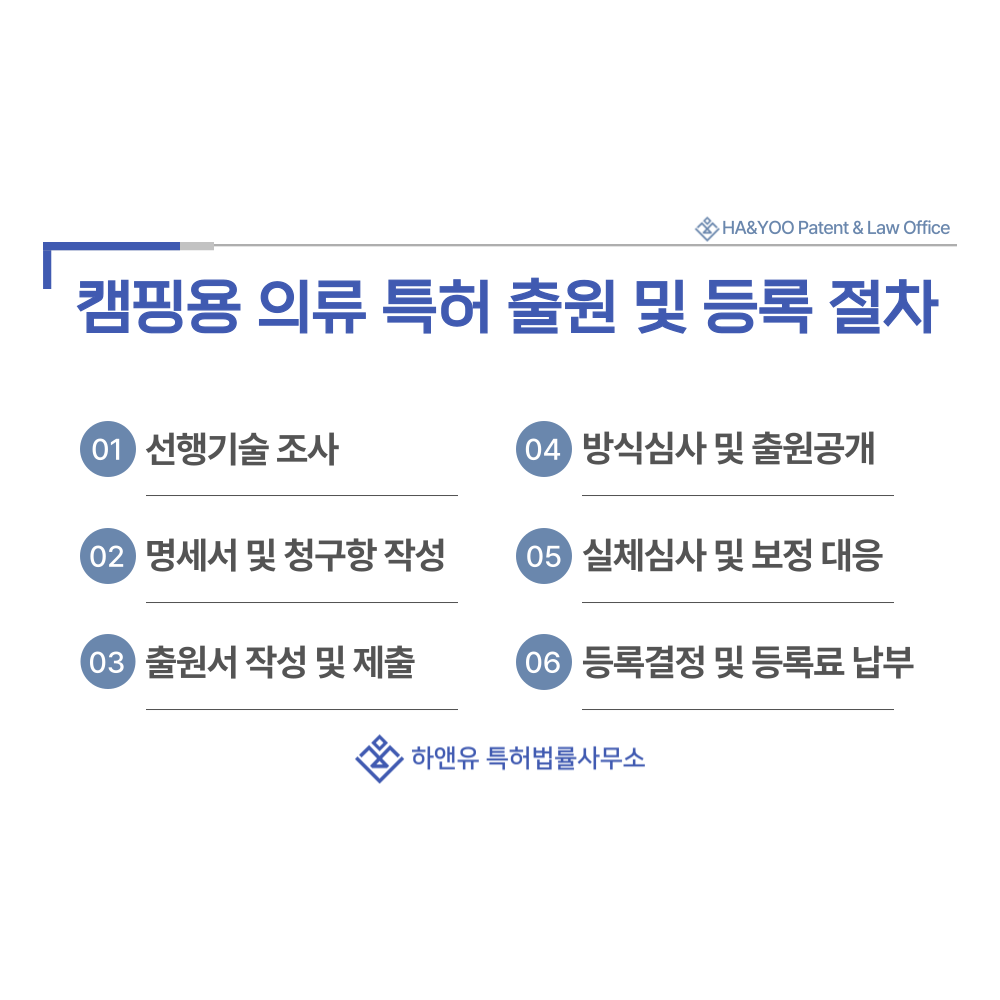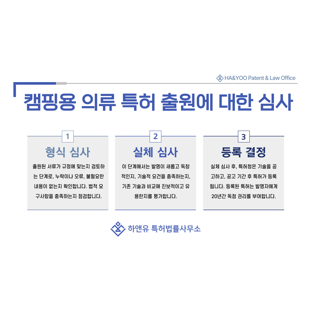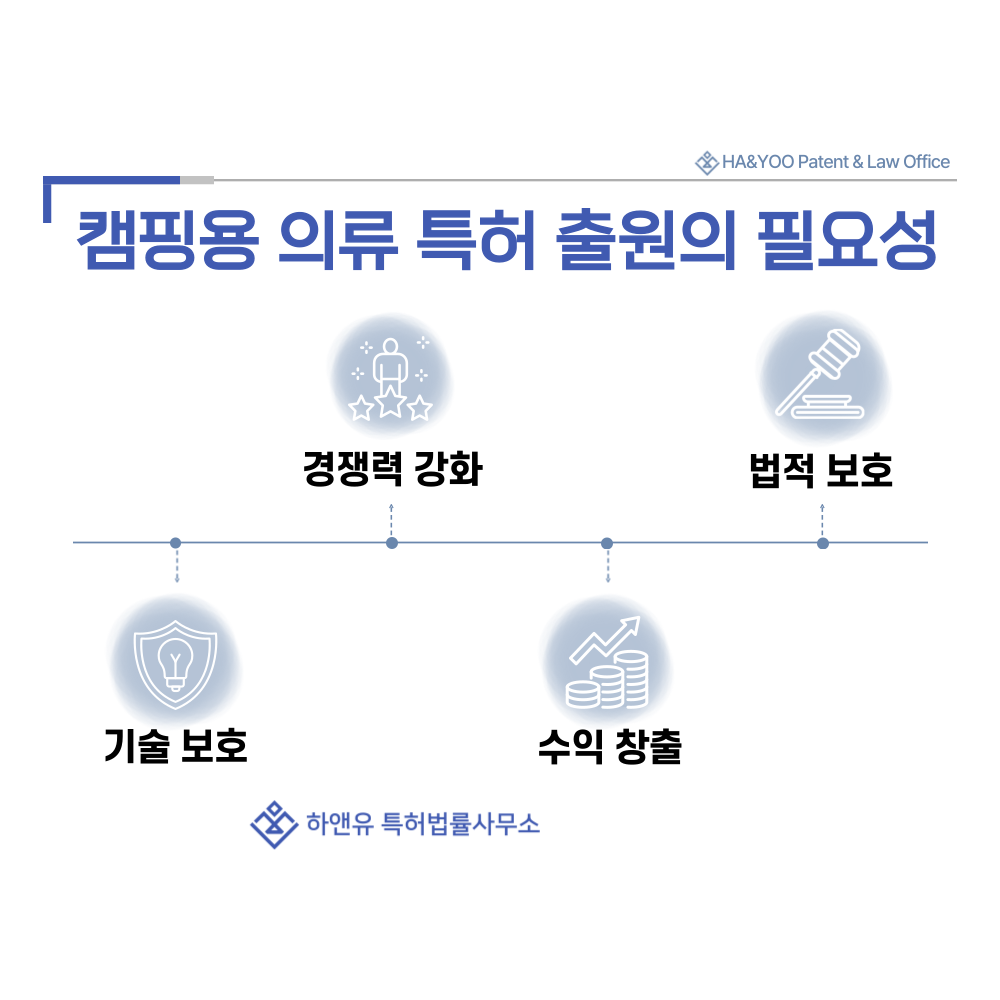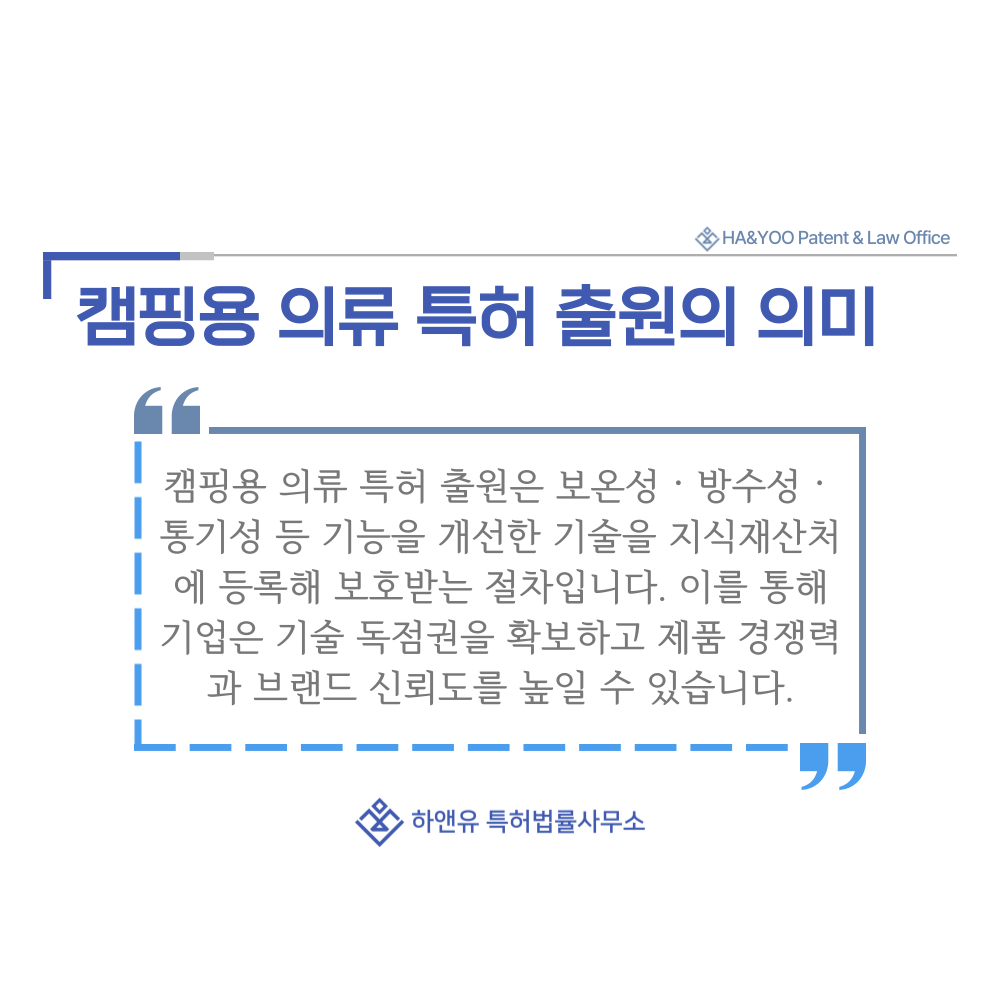 즉, 캠핑용 의류나 장비 관련 기술을 보호하기 위해서는 특허 출원이 향후 법적 안정성과 브랜드 신뢰도를 동시에 보장하는 필수 절차입니다.