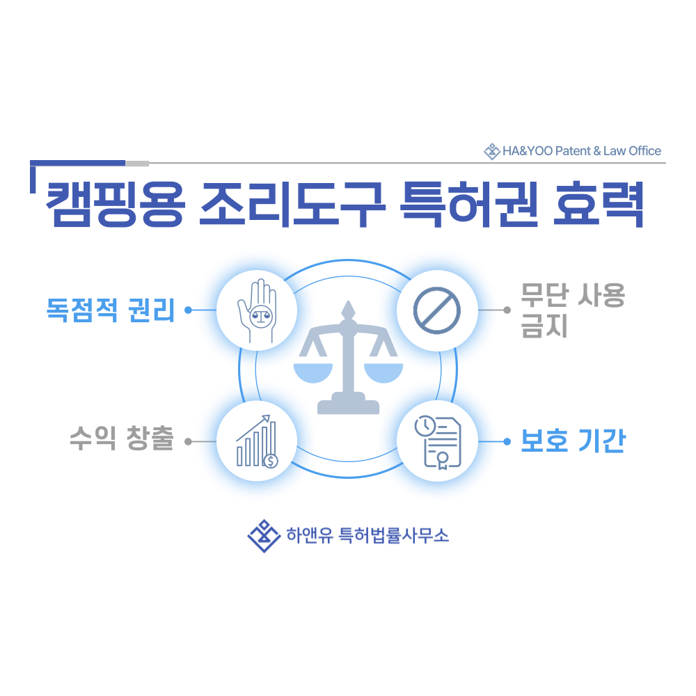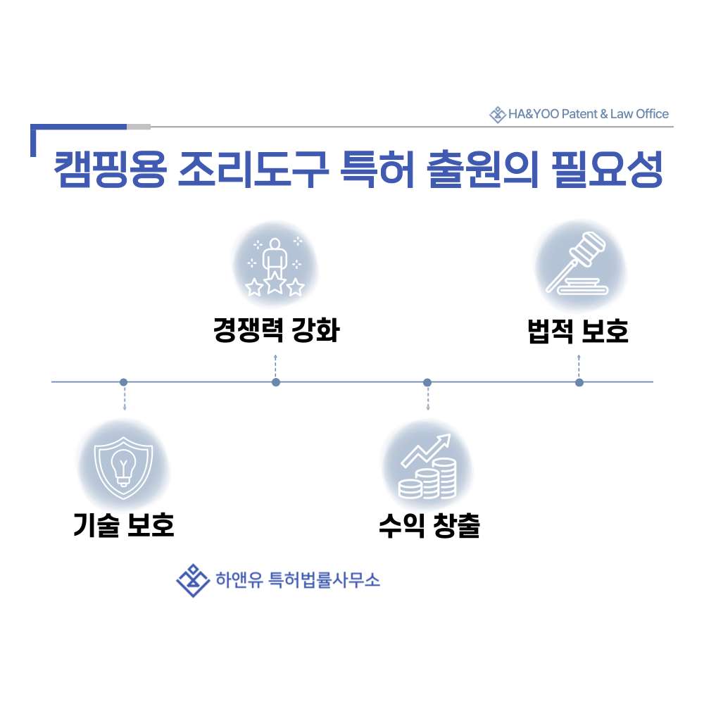 즉, 특허는 캠핑용 제품의 기술 혁신을 단순한 아이디어가 아닌 경제적 이익으로 전환시키는 핵심 수단입니다.