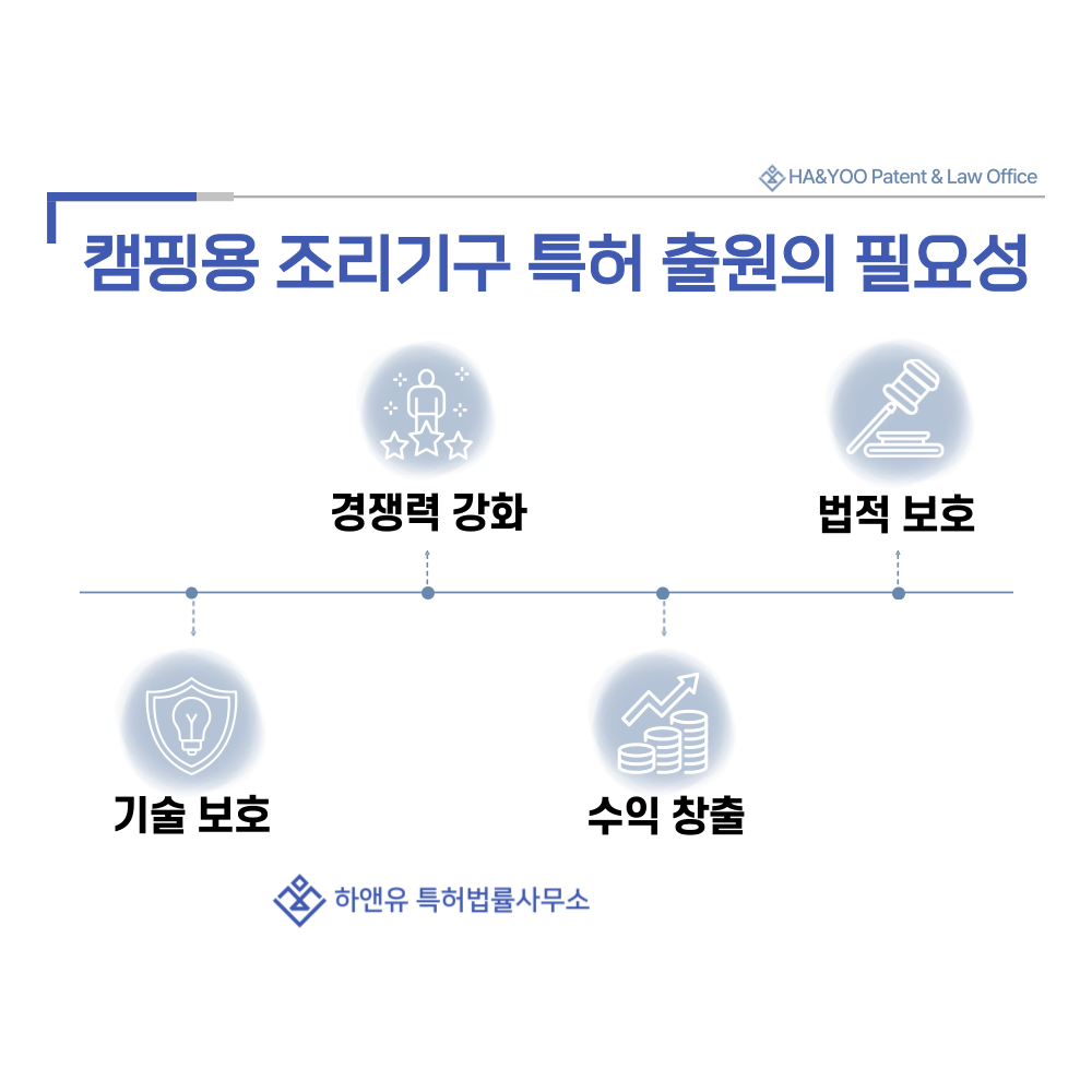 연소 구조, 화력 조절 방식, 접이식 구조, 안전 설계처럼 기술적 차별 요소를 권리로 만드는 과정입니다.