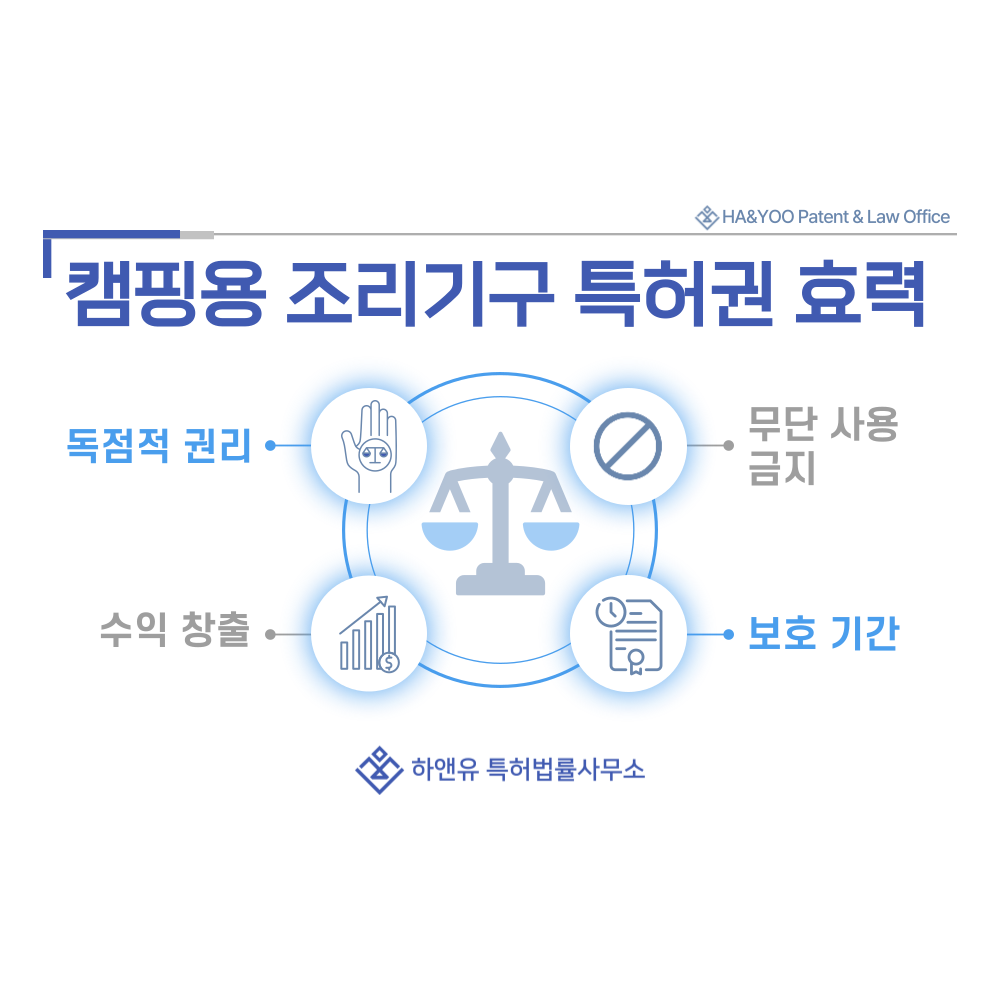 캠핑용 화구, 스토브, 버너, 그릴, 오븐 특허권이 등록되면 해당 기술은 권리자만 사용할 수 있는 독점 자산이 됩니다.