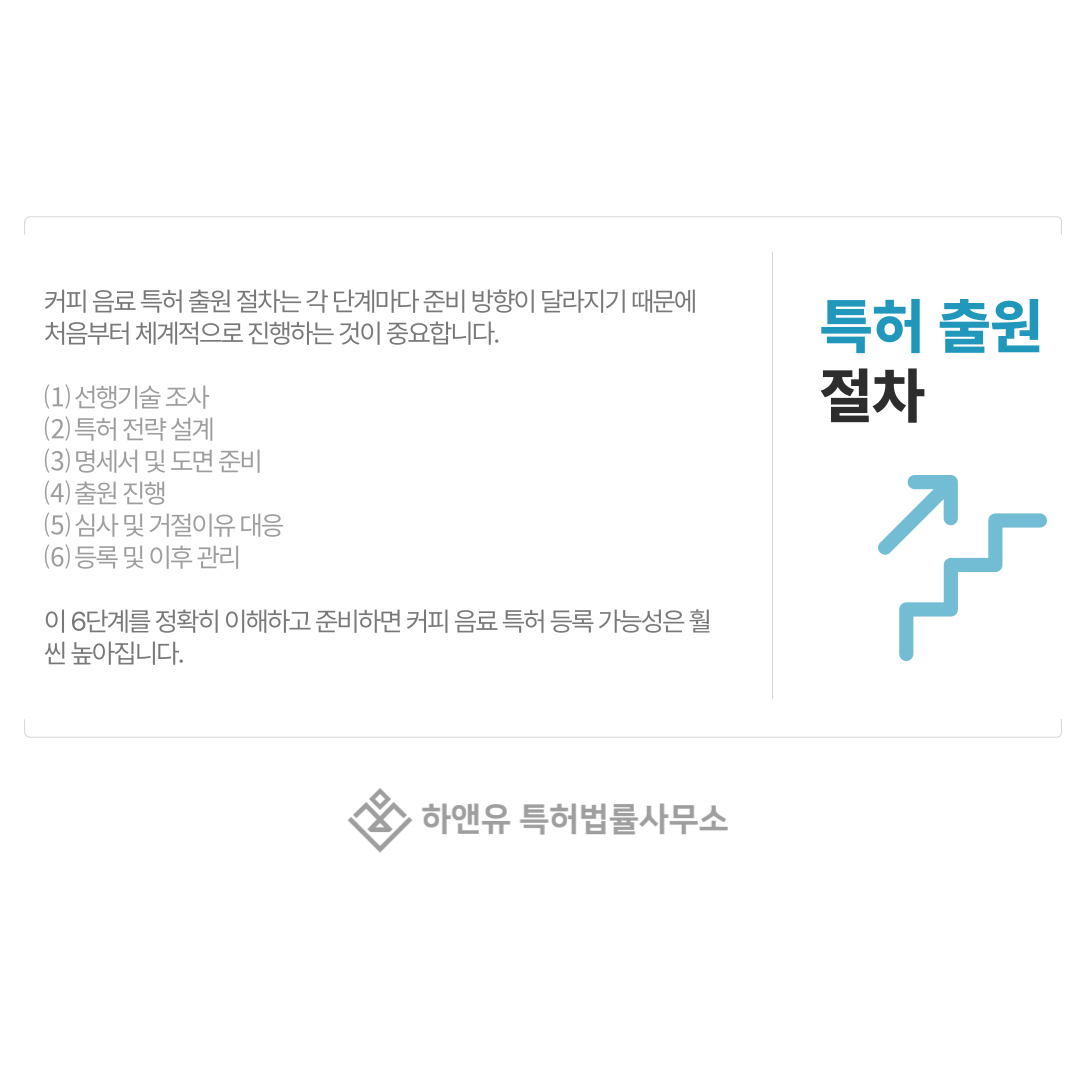 이 6단계를 정확히 이해하고 준비하면 커피 음료 특허 등록 가능성은 훨씬 높아집니다.