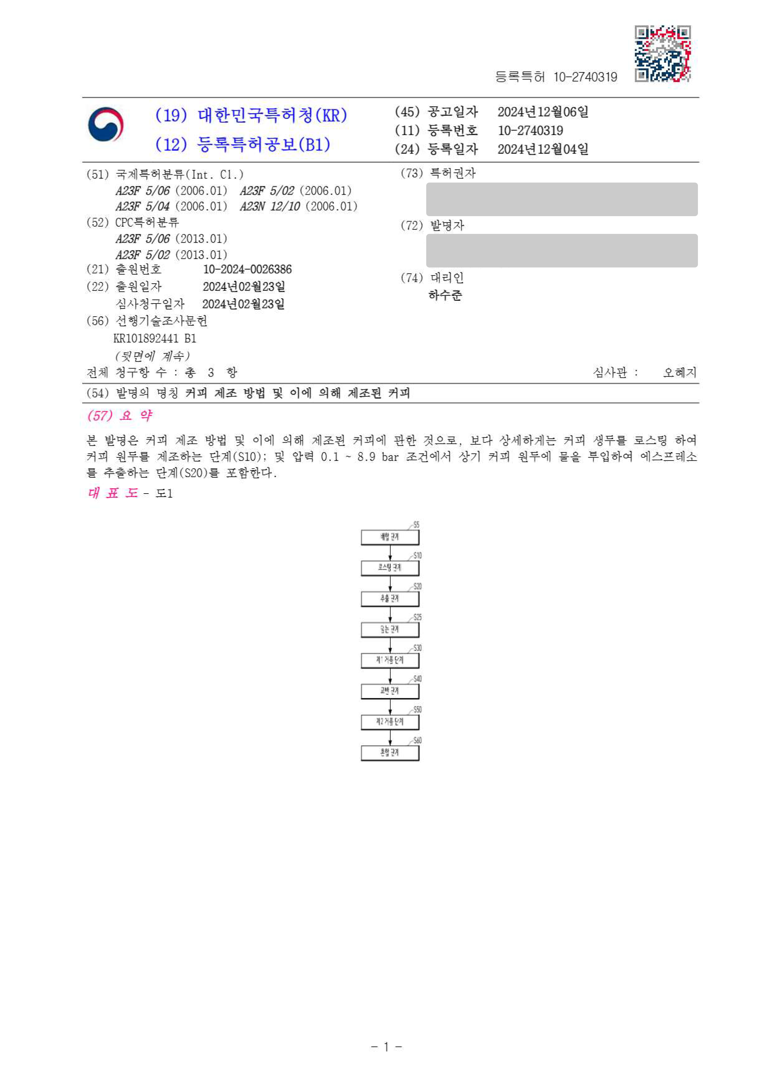 하앤유특허법률사무소를 통해 출원 등록된 커피 음료 특허 등록사례입니다.