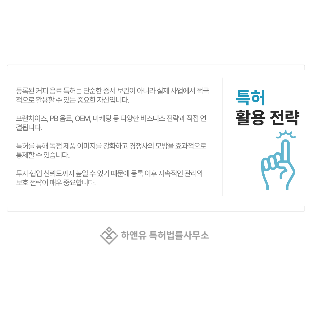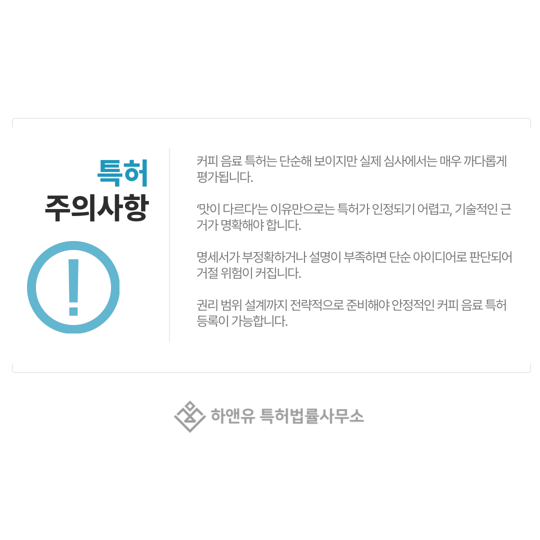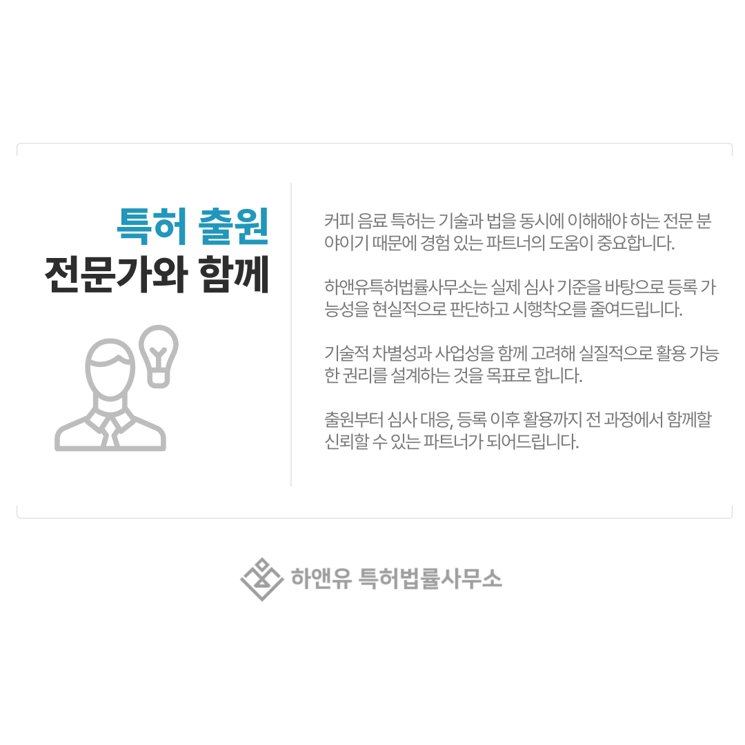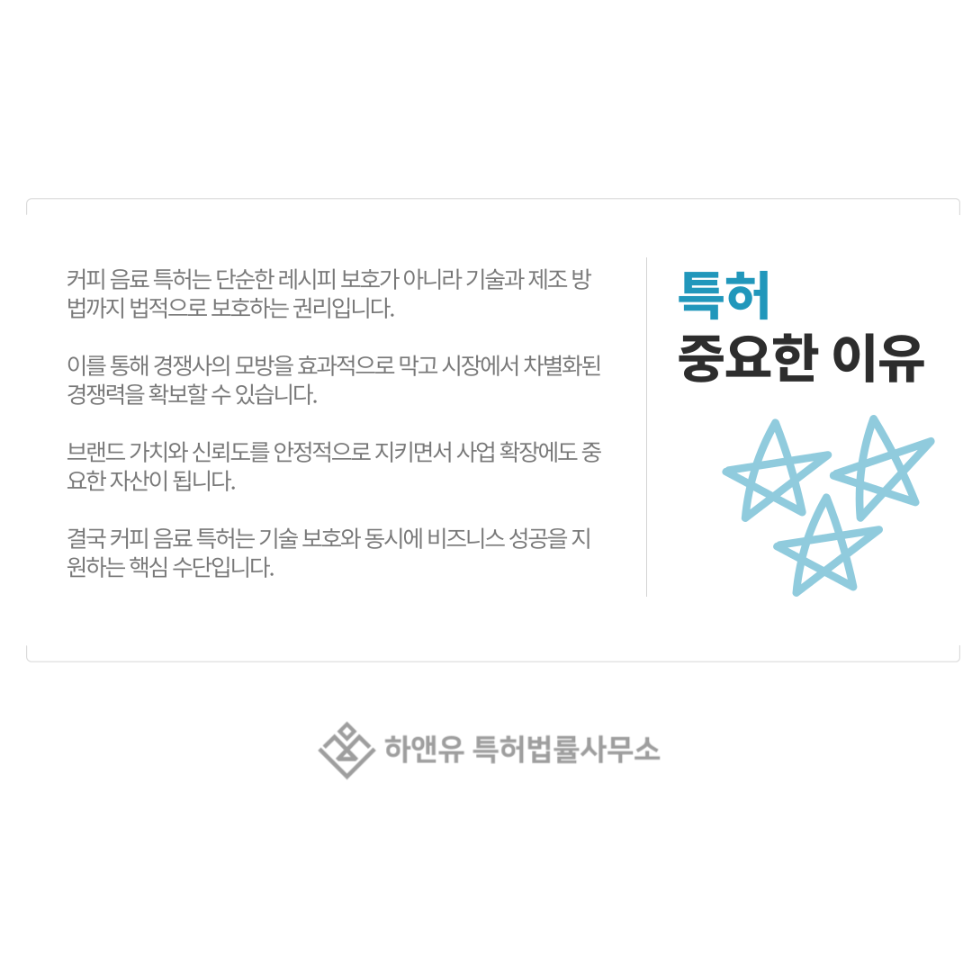 #커피음료특허 #커피특허 #음료특허 #식품특허 #커피신제품 #카페메뉴개발 #지식재산권 #지식재산처 #MOIP #특허전문변리사 #특허출원 #특허등록 #특허권 #PatentRegistration #PatentApplication #특허사무소 #특허법률사무소 #하앤유특허법률사무소