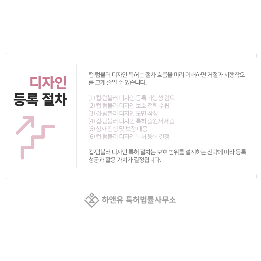 컵·텀블러 디자인 특허 출원 및 등록 절차는 단계별로 이해하시면 어렵지 않습니다.