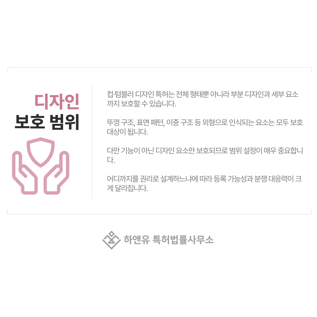 다만 컵·텀블러 디자인 특허는 기능 자체를 보호하는 제도는 아닙니다.