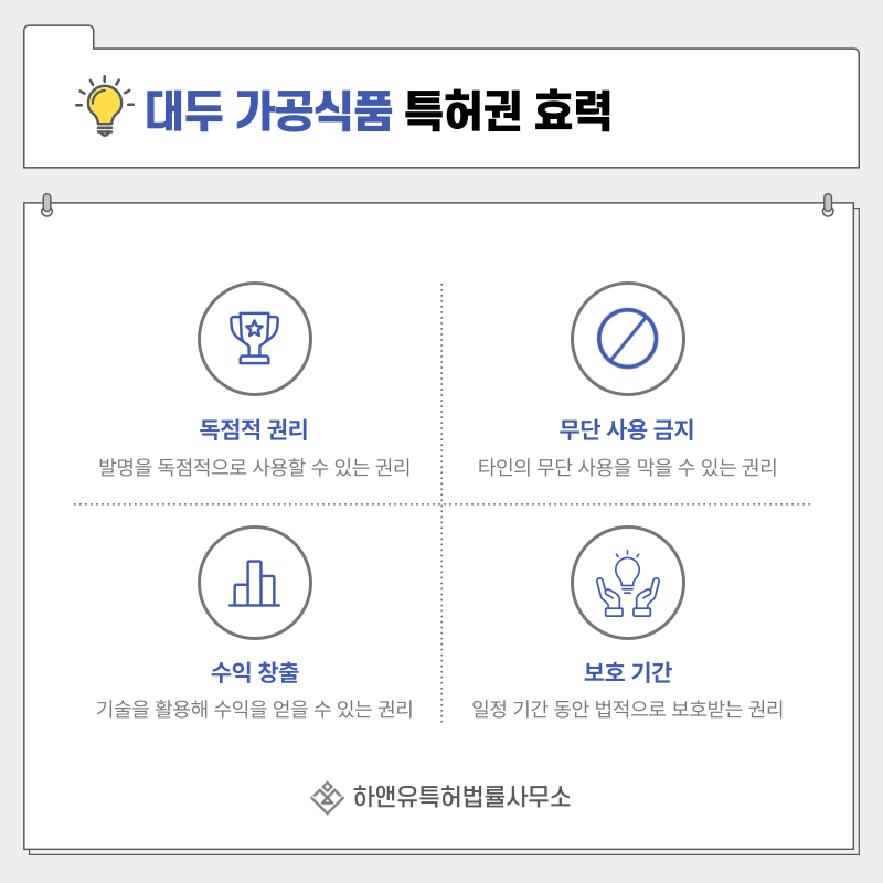특허권이 등록되면 해당 콩 식품 기술에 대해 일정 기간 독점적으로 사용할 수 있는 권리가 부여됩니다.