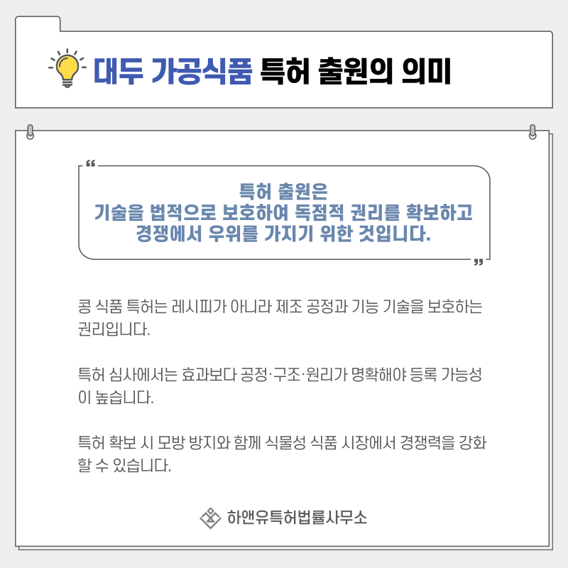 콩요리, 두유, 두부, 청국장과 같은 콩 식품의 특허 출원은 단순한 레시피를 보호하는 것이 아니라
