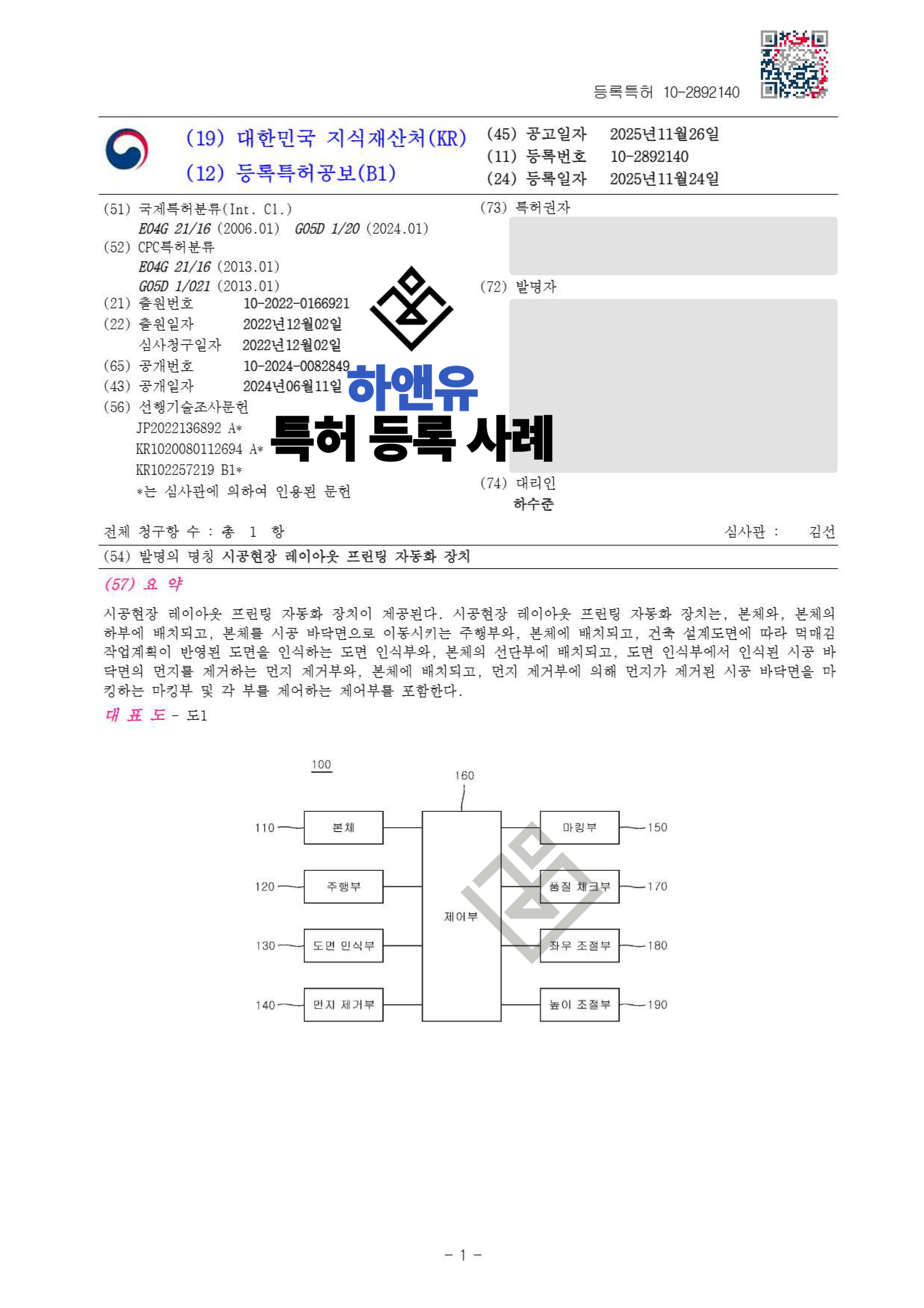 하앤유특허법률사무소에서 시공현장 레이아웃 프린팅 자동화 장치 특허를 성공적으로 등록하였습니다.