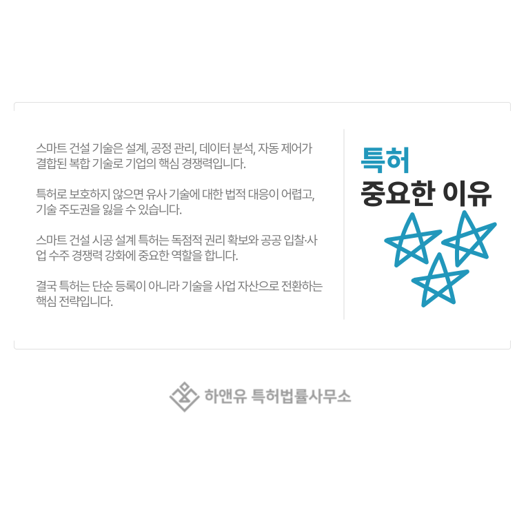 이처럼 스마트 건설 시공 설계 특허는 단순한 설계 결과물이 아니라, 그 과정에서 작동하는 기술 구조를 보호하는 제도입니다.