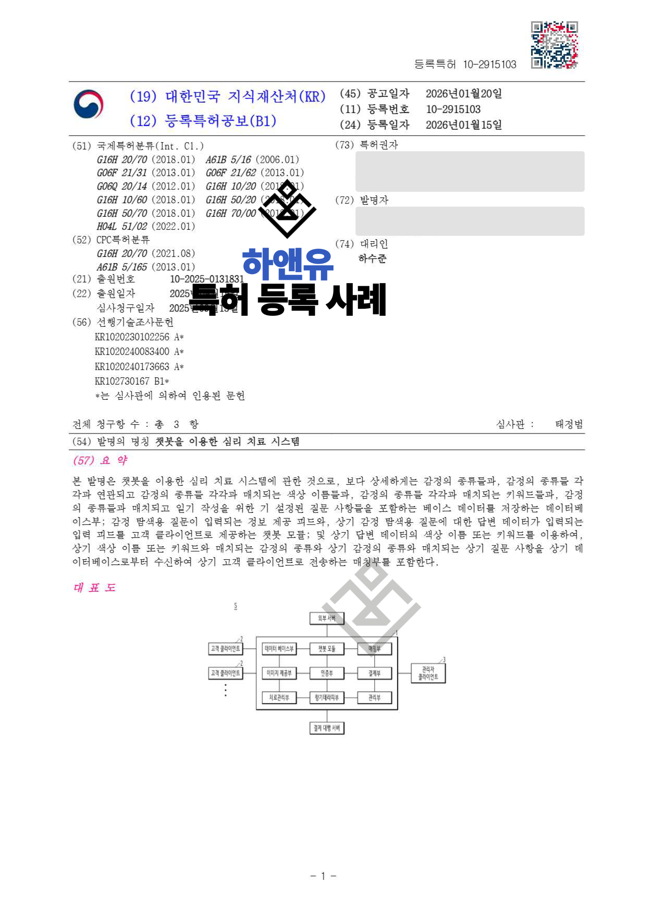 #AI헬스케어 #챗봇심리치료 #심리치료챗봇 #AI심리상담 #인지행동치료 #CBT챗봇 #의료AI #개인화대화모델 #감정인식AI #의료데이터보호 #특허출원 #특허등록 #특허권 #특허등록사례 #PatentRegistration #PatentApplication #특허사무소 #특허법률사무소 #하앤유특허법률사무소