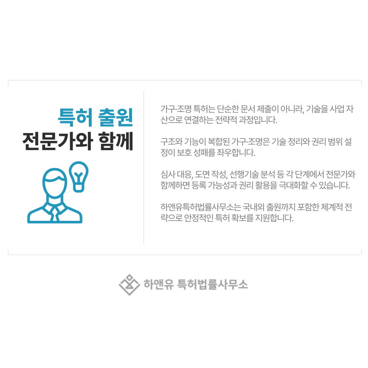 가구·조명 분야에서는 구조나 작동 방식을 보호한 특허가 특히 강력한 방어 수단이 됩니다.