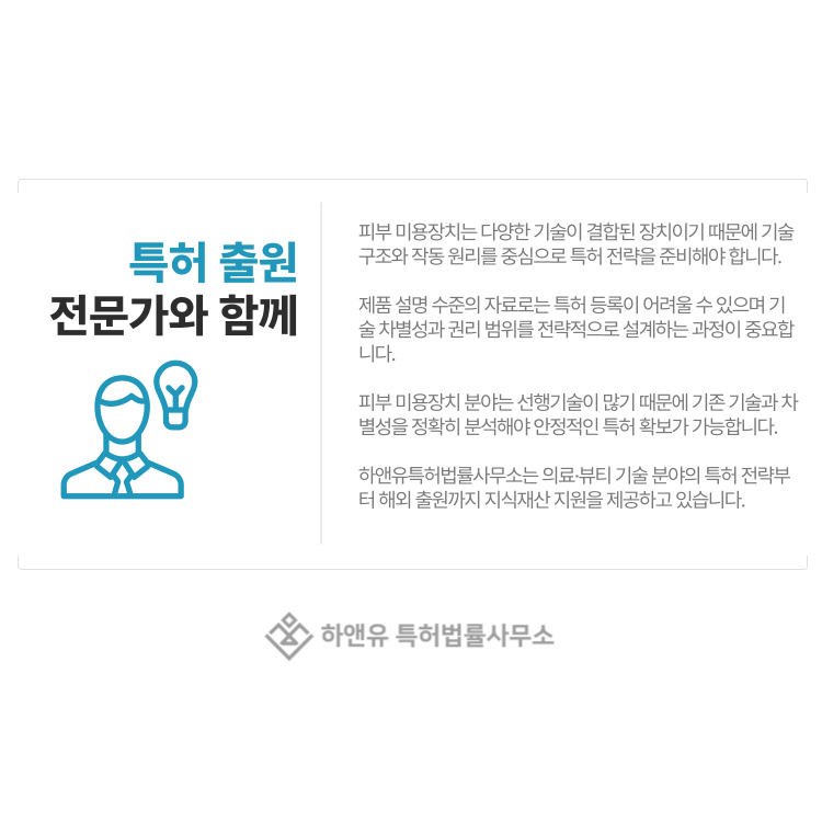 이처럼 피부 미용장치 특허는 기술 이해, 선행기술 분석, 권리 범위 설계가 함께 이루어져야 안정적인 등록 가능성을 확보할 수 있습니다.