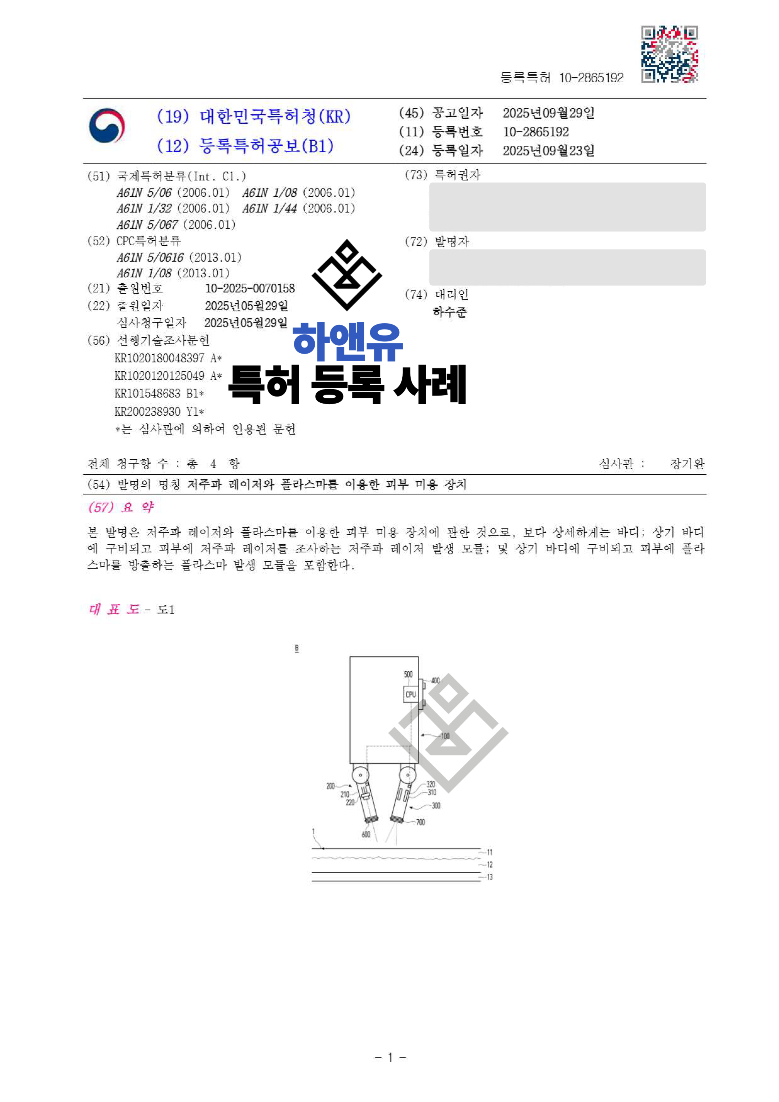 하앤유특허법률사무소에서 저주파 레이저와 플라스마를 이용한 피부 미용 장치 특허를 성공적으로 등록하였습니다.