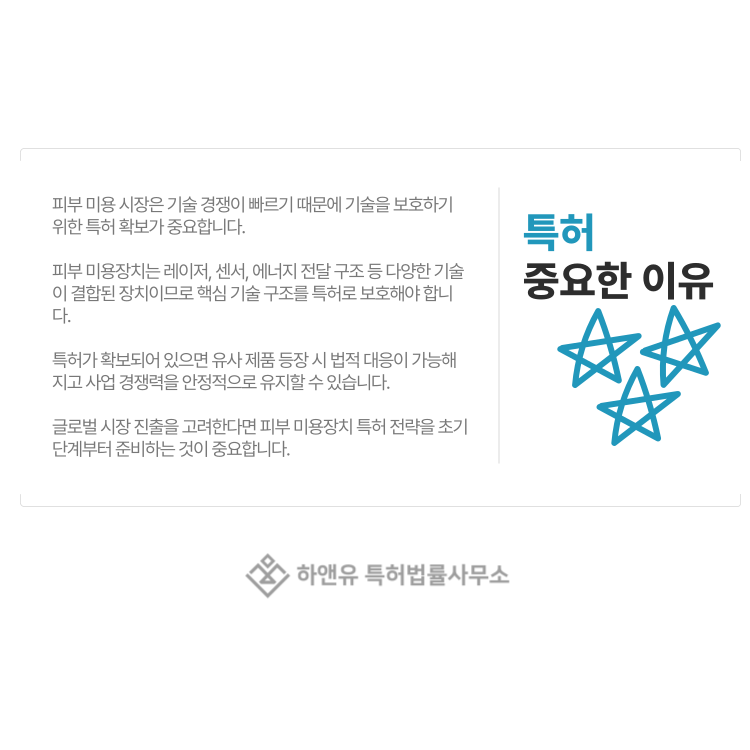 특히 피부 미용장치는 글로벌 시장 규모가 매우 큰 분야이기 때문에 특허 확보 여부가 사업 확장에도 큰 영향을 미칠 수 있습니다.